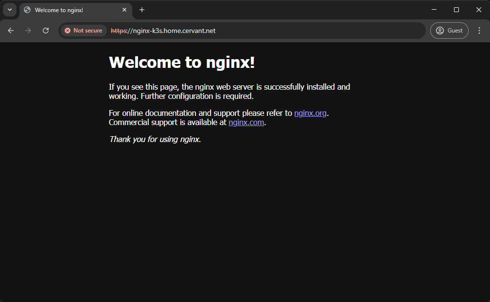 Si verificamos en un navegador, vemos que nginx-k3s.home.cervant.net ya está respondiendo con la bienvenida de Nginx.